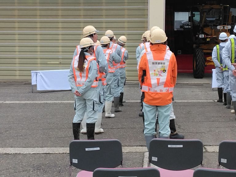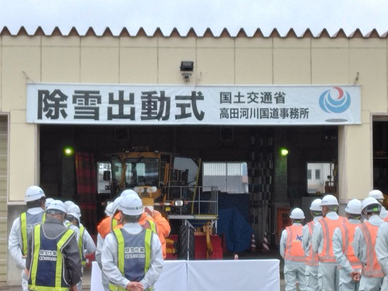 国道除雪の出動式が行われ、上越管内の国道を除雪する4社が集まりました。
