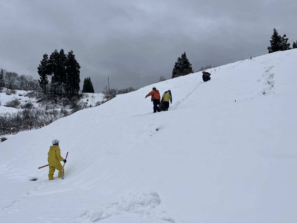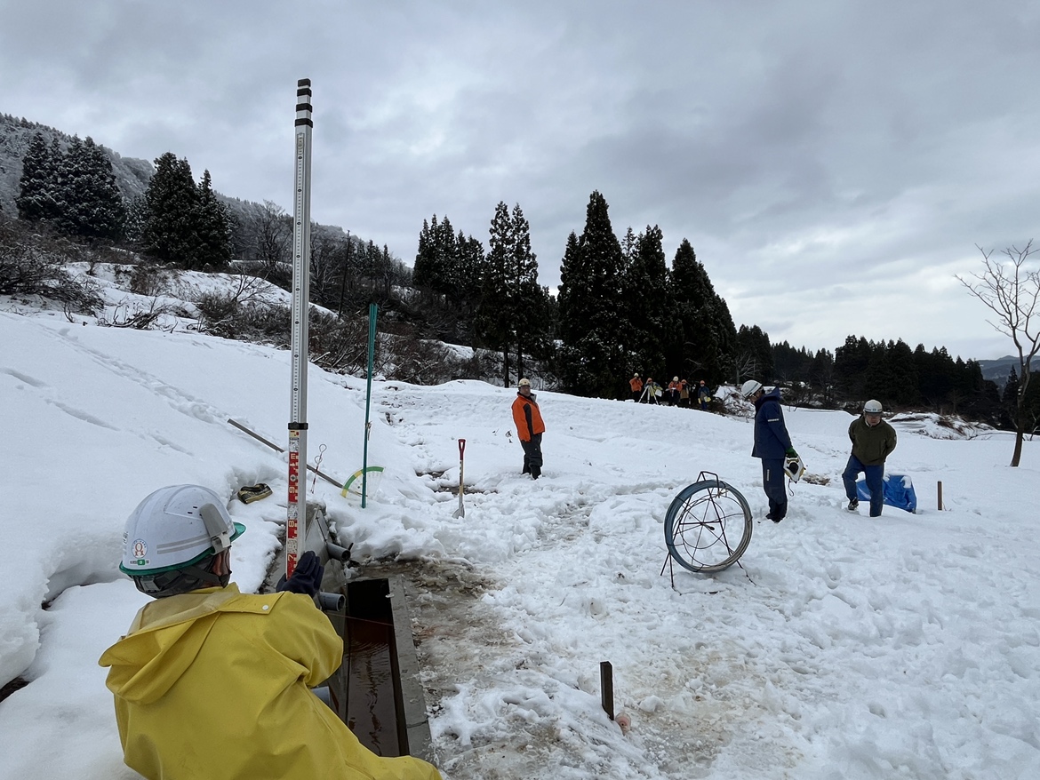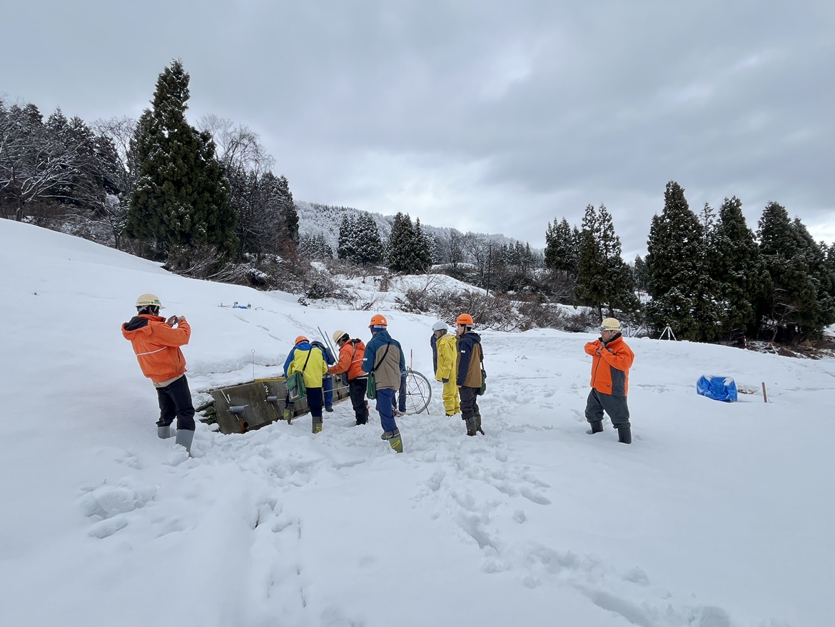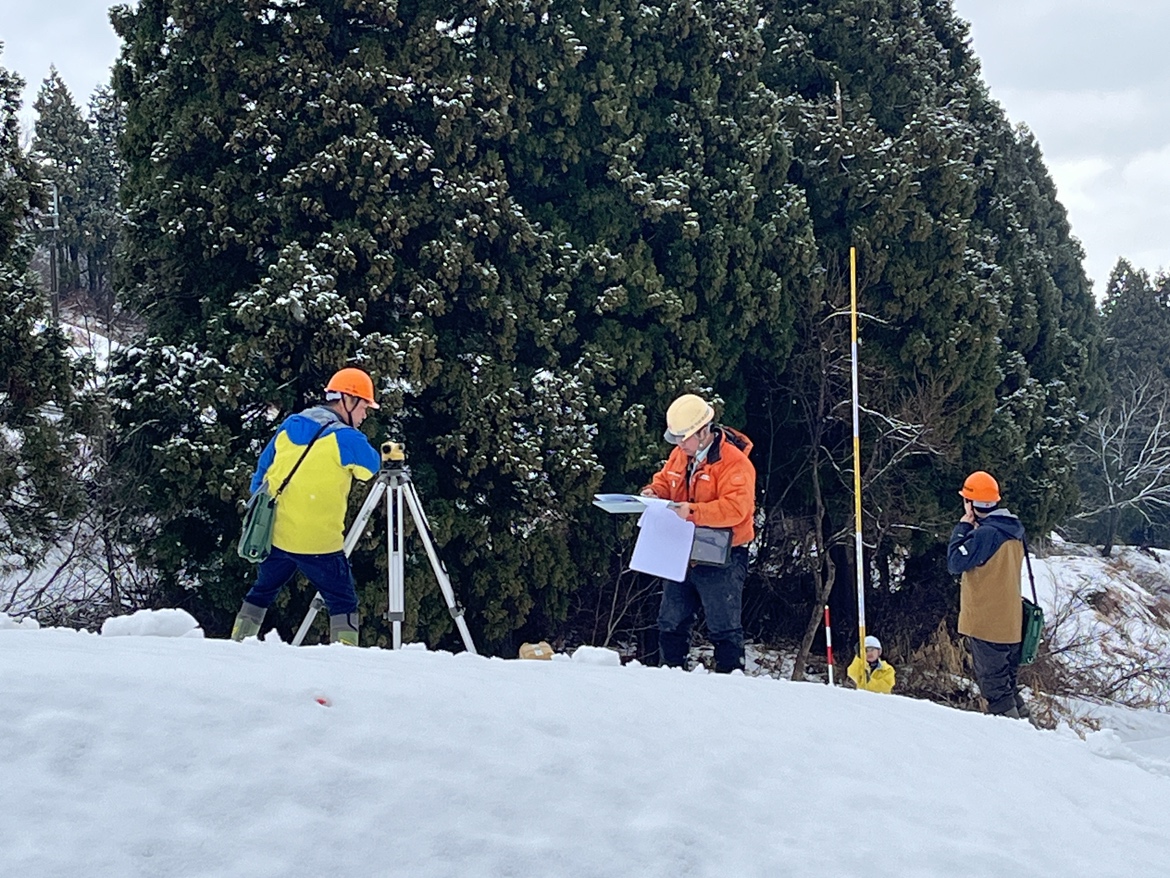 検査の日は雪がたくさん積もっていて、現場は真っ白な景色になっていました。作業員の皆さんは雪かきをしながら、足元に気をつけて測量などの作業を進めていました。私たちも滑らないよう注意しながら、工事の内容を一つひとつ確認しました。
