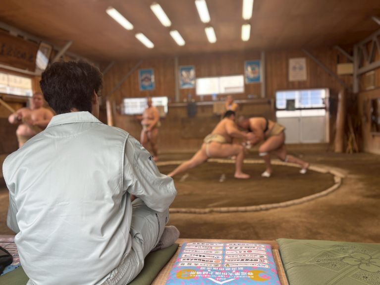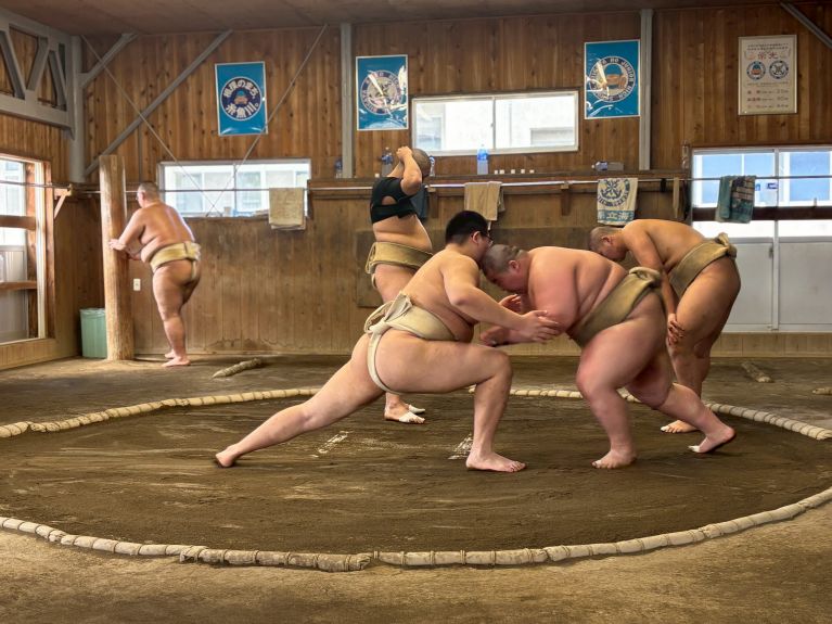 三年生が卒業したばかりの春休み中にもかかわらず、相撲部の皆さんは熱心に稽古に励んでいました。特に試合形式の練習は迫力満点で、見ているこちらまで思わず手に汗を握るほど。学生たちの気迫と真剣さに、胸が熱くなる時間でした。