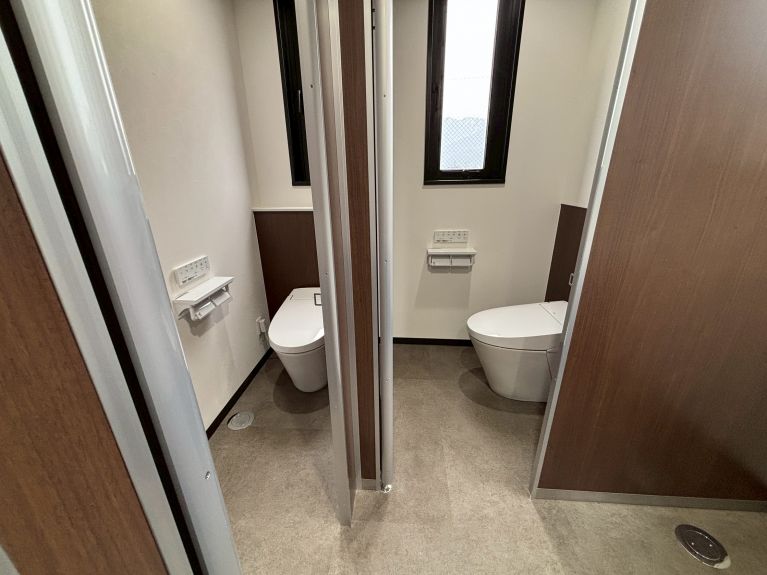 特に2階のトイレブースでは、建具のエッジに木を使った特注仕様を採用し、やさしく上質な雰囲気に仕上げました。こうした細部へのこだわりも、今回の改修の見どころのひとつです。