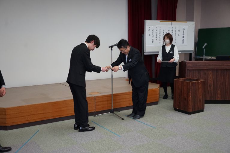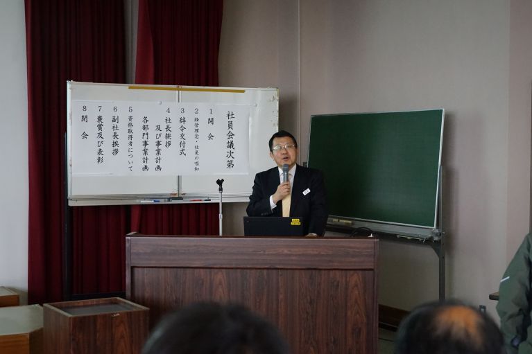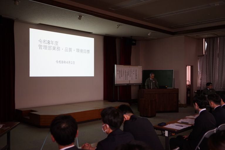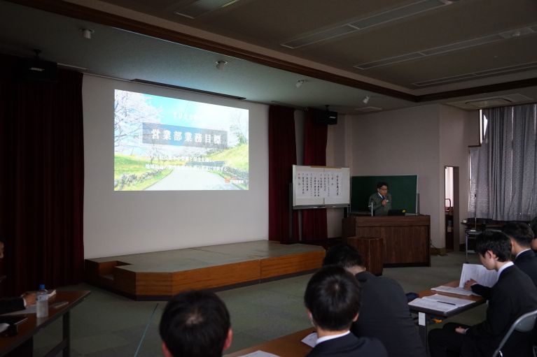 入社式に続いて開催された社員会議では、社長および各部門長から今年度の目標が発表されました。それぞれの想いと方針に触れ、目標に向けて気持ちが一段と引き締まる時間となりました。