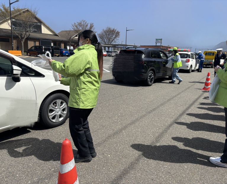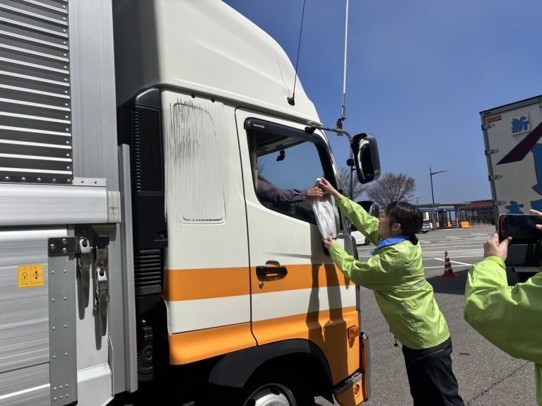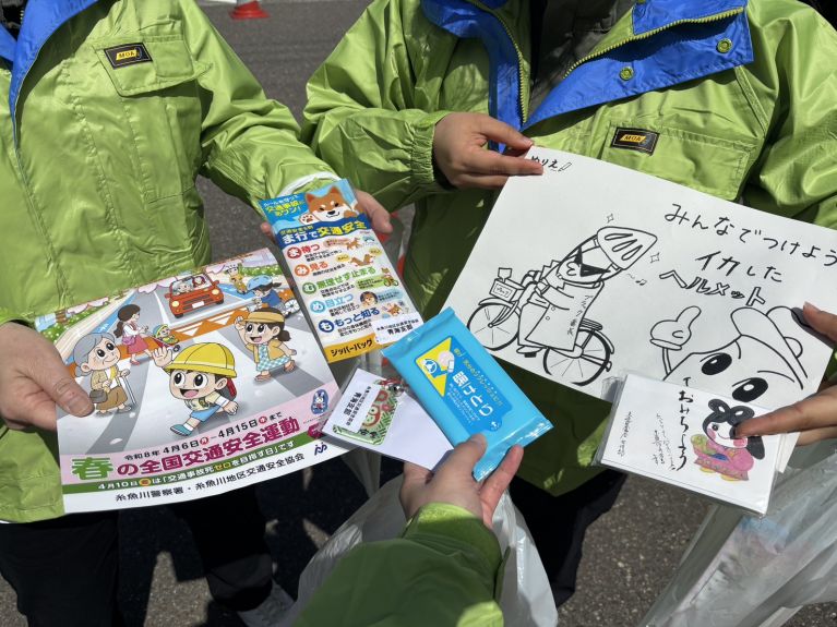 当日は、行き交うドライバーお一人お一人に交通安全への意識を高めていただけるよう、糸魚川警察署職員の皆様が心を込めて制作された塗り絵や、交通安全協会様よりご提供いただいた啓発グッズをお配りしました。
