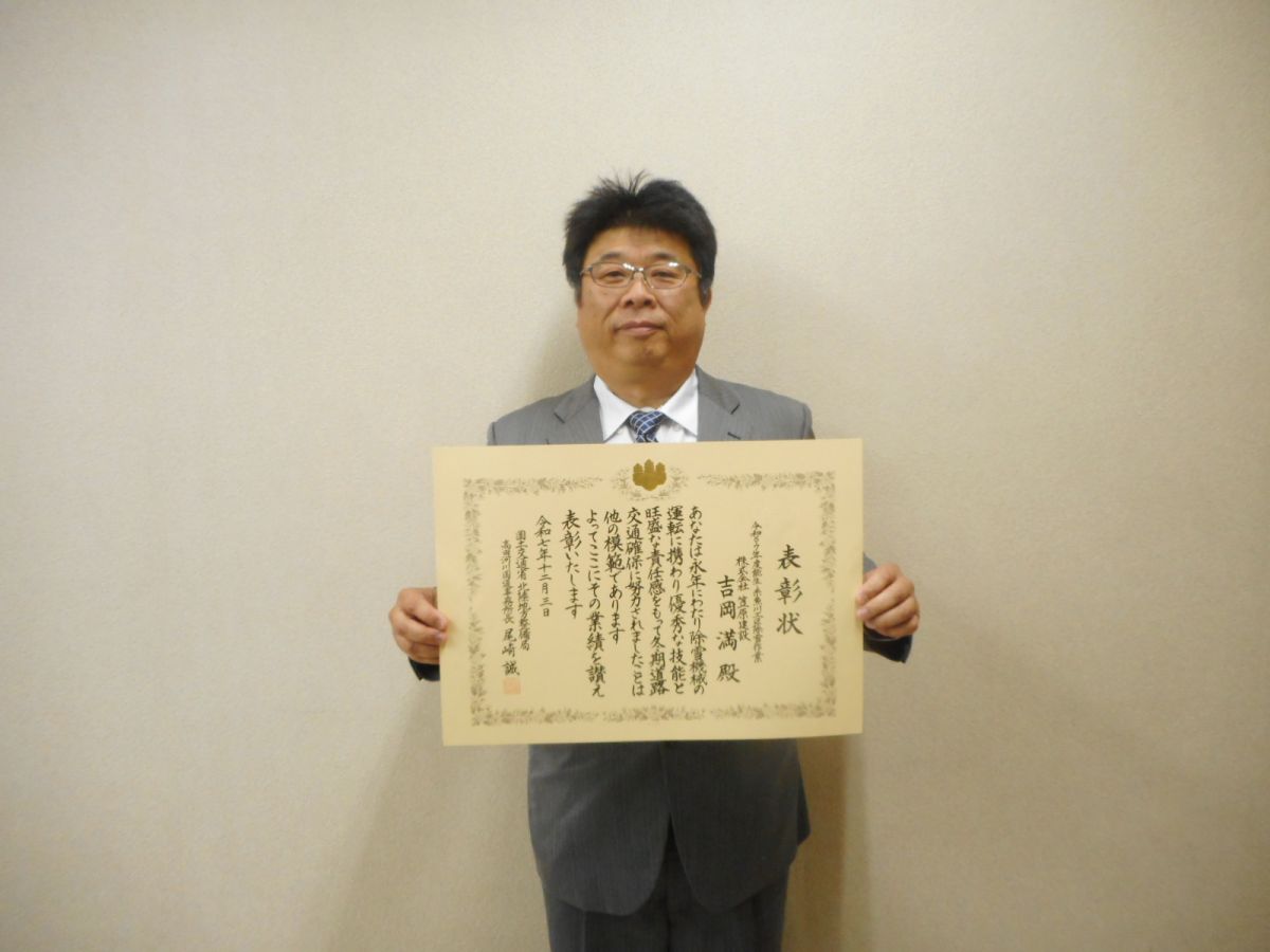 このたび、我が社の業務として取り組んできた 除雪活動 において、永年にわたり除雪機械の運転に携わり優秀な技能と旺盛な責任感をもって冬期道路交通確保に努力したとして、当社機械技工課の 吉岡満 が表彰状をいただきました。