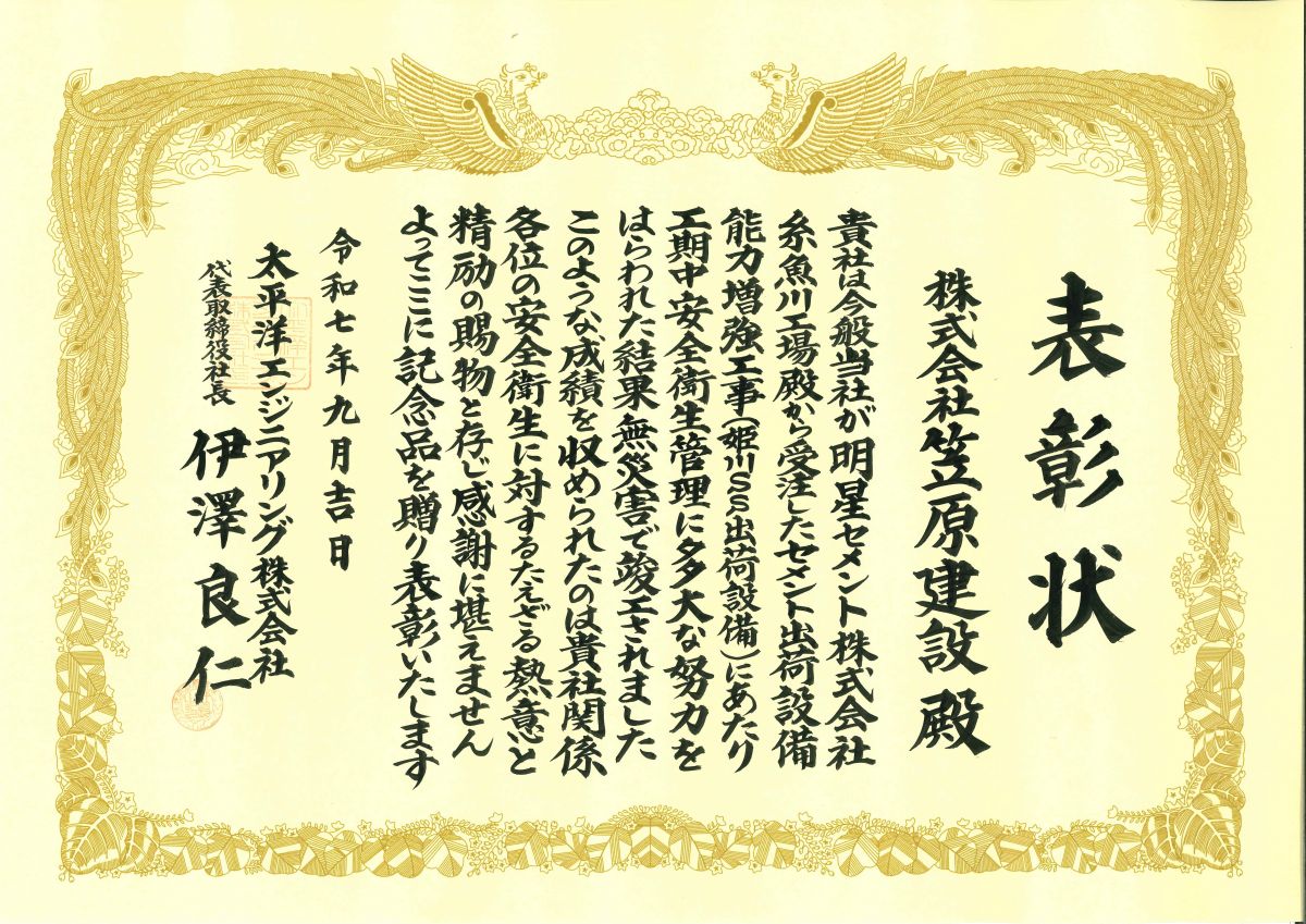 このたび、当社が担当した工事において、無災害を達成したことが評価され、太平洋エンジニアリング株式会社様より表彰をいただきました。安全を最優先に取り組んできた日々が形となり、非常に光栄であり、社員一同大きな励みとなっています。