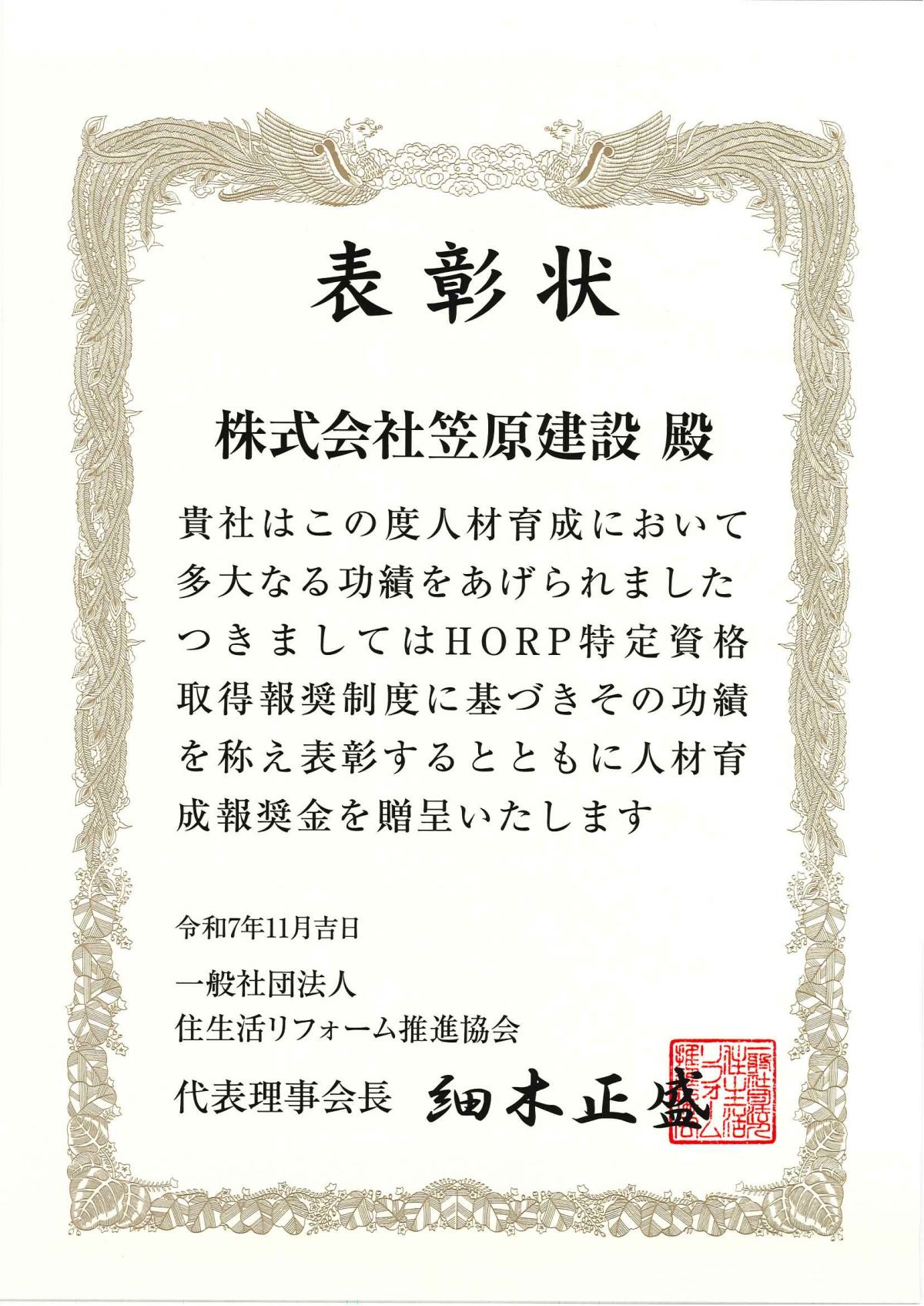 このたび 新潟営業所 花野さん の2級建築士取得に伴い、住生活リフォーム推進協会 より表彰されました。
