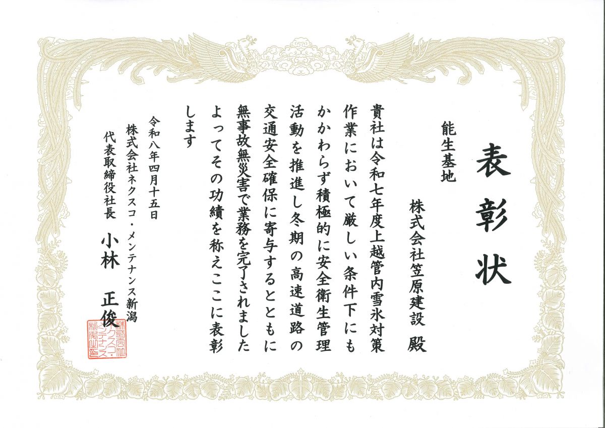 株式会社ネクスコ・メンテナンス新潟様より表彰状をいただきました。